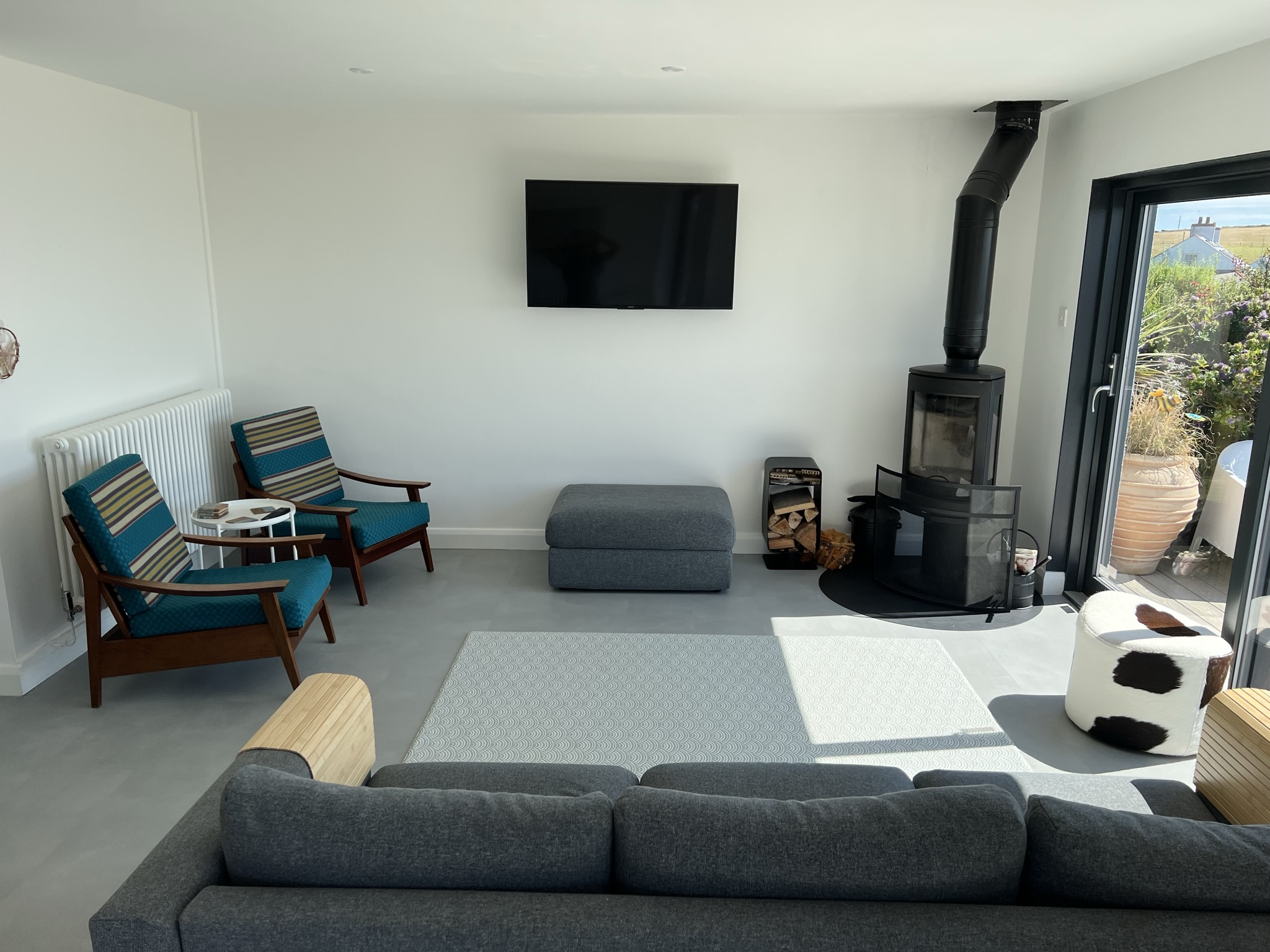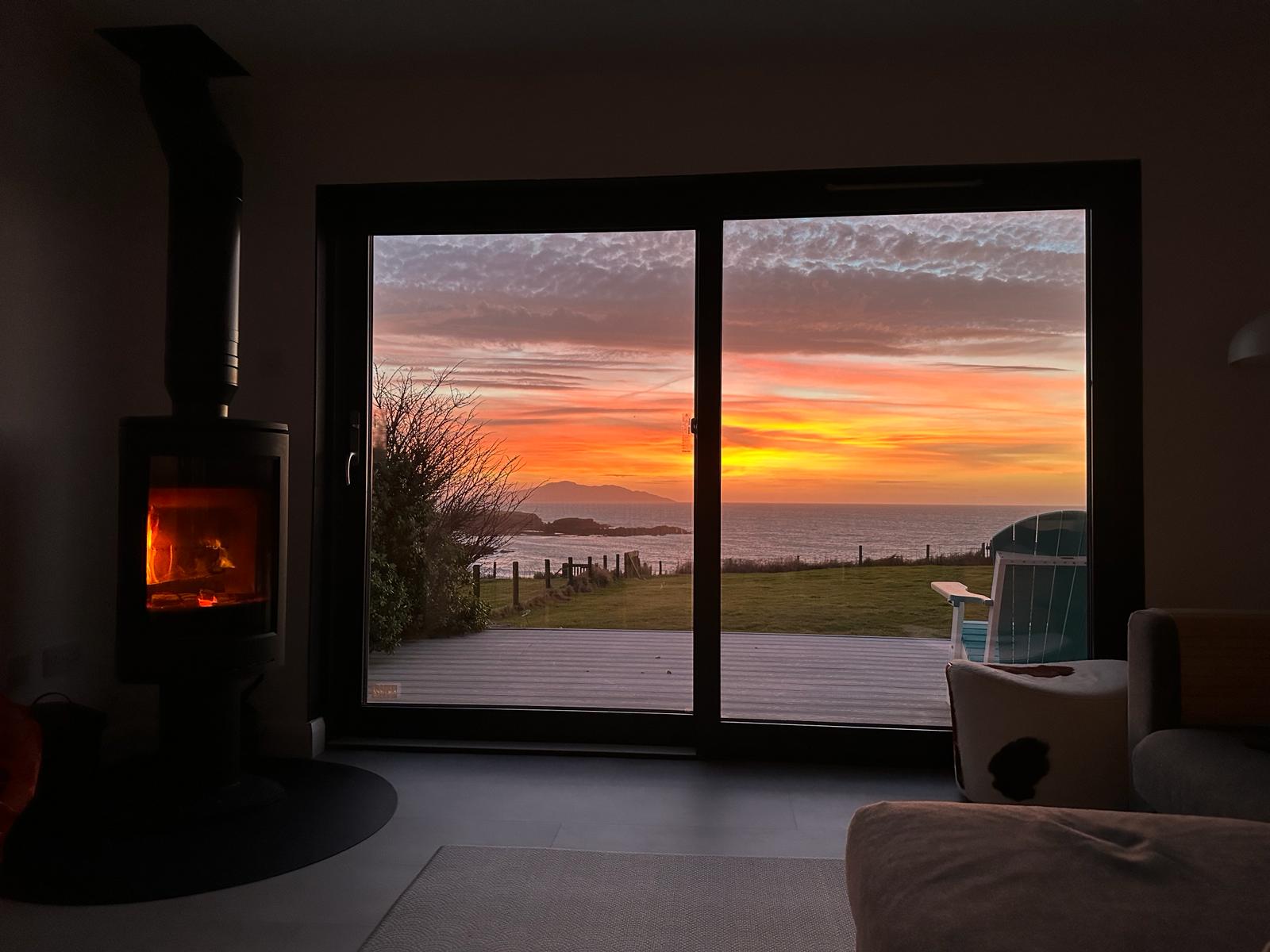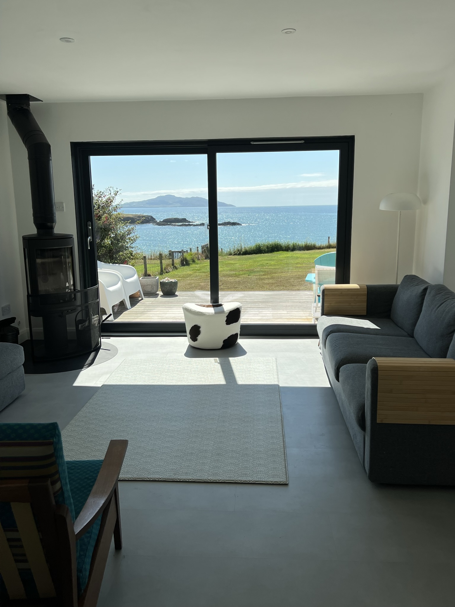 The majority of the living space, bedrooms and bathrooms are located on the ground floor of The Annexe, where you will find our open plan kitchen/diner and lounge. The wooden kitchen was handmade by a joiner from the island and is fully equipped with all the essentials you’d expect from us. The stunning copper dining table and chairs has one of the best backdrops to enjoy your meals, with large floor to ceiling patio doors offering views out into the garden, beach and sea beyond.