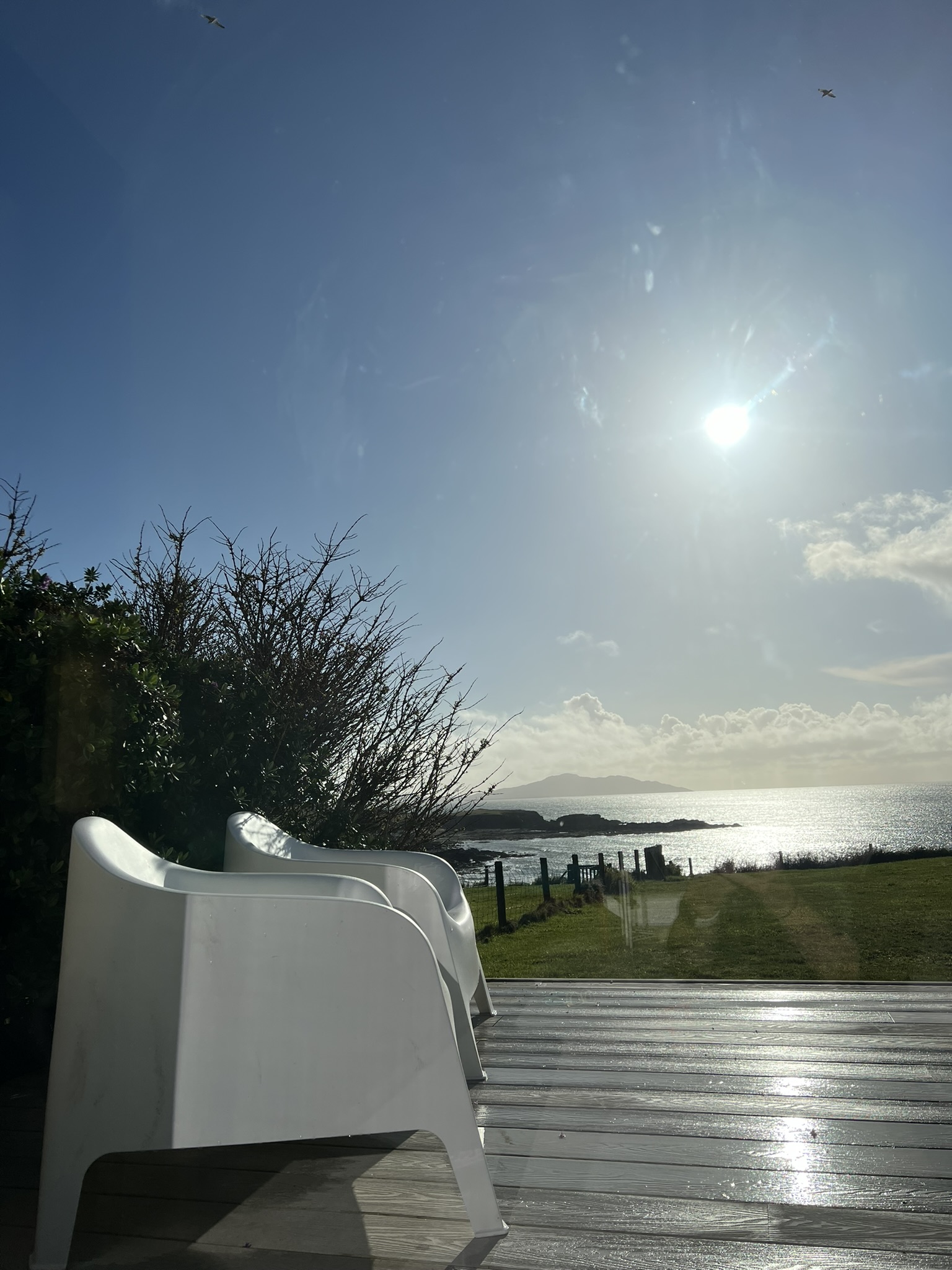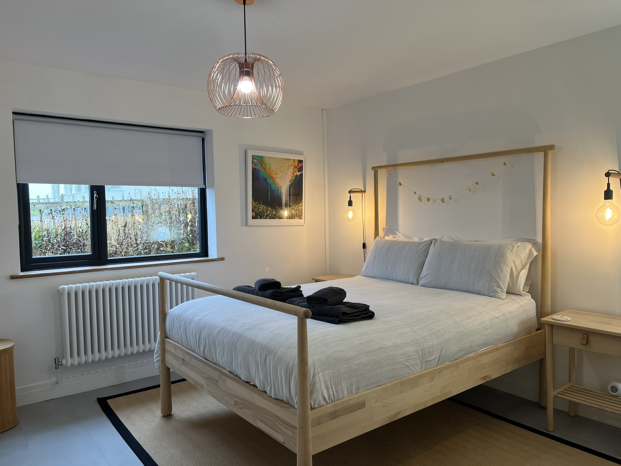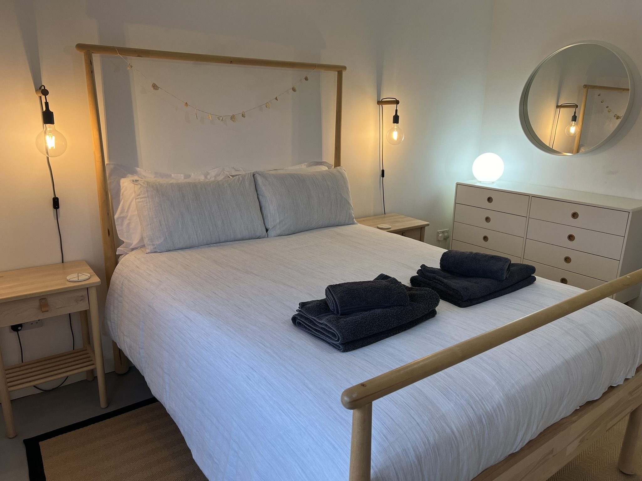 The majority of the living space, bedrooms and bathrooms are located on the ground floor of The Annexe, where you will find our open plan kitchen/diner and lounge. The wooden kitchen was handmade by a joiner from the island and is fully equipped with all the essentials you’d expect from us. The stunning copper dining table and chairs has one of the best backdrops to enjoy your meals, with large floor to ceiling patio doors offering views out into the garden, beach and sea beyond.